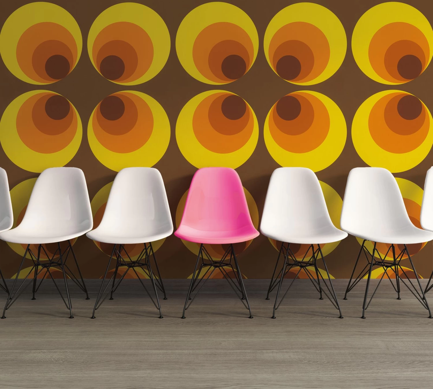 Ob farbiges Spiralen- oder Wellendekor, versetzt übereinander gedruckte Kreise, oder an Op-Art angelehnte Schwarz-Weiß-Muster, die Kollektion Retro deluxe ist ein attraktiver Blickfang fürs moderne Interieur. Ergänzt werden die Dekortapeten durch unifarbene oder zarte Streifentapeten im dazu passenden Farbspektrum.