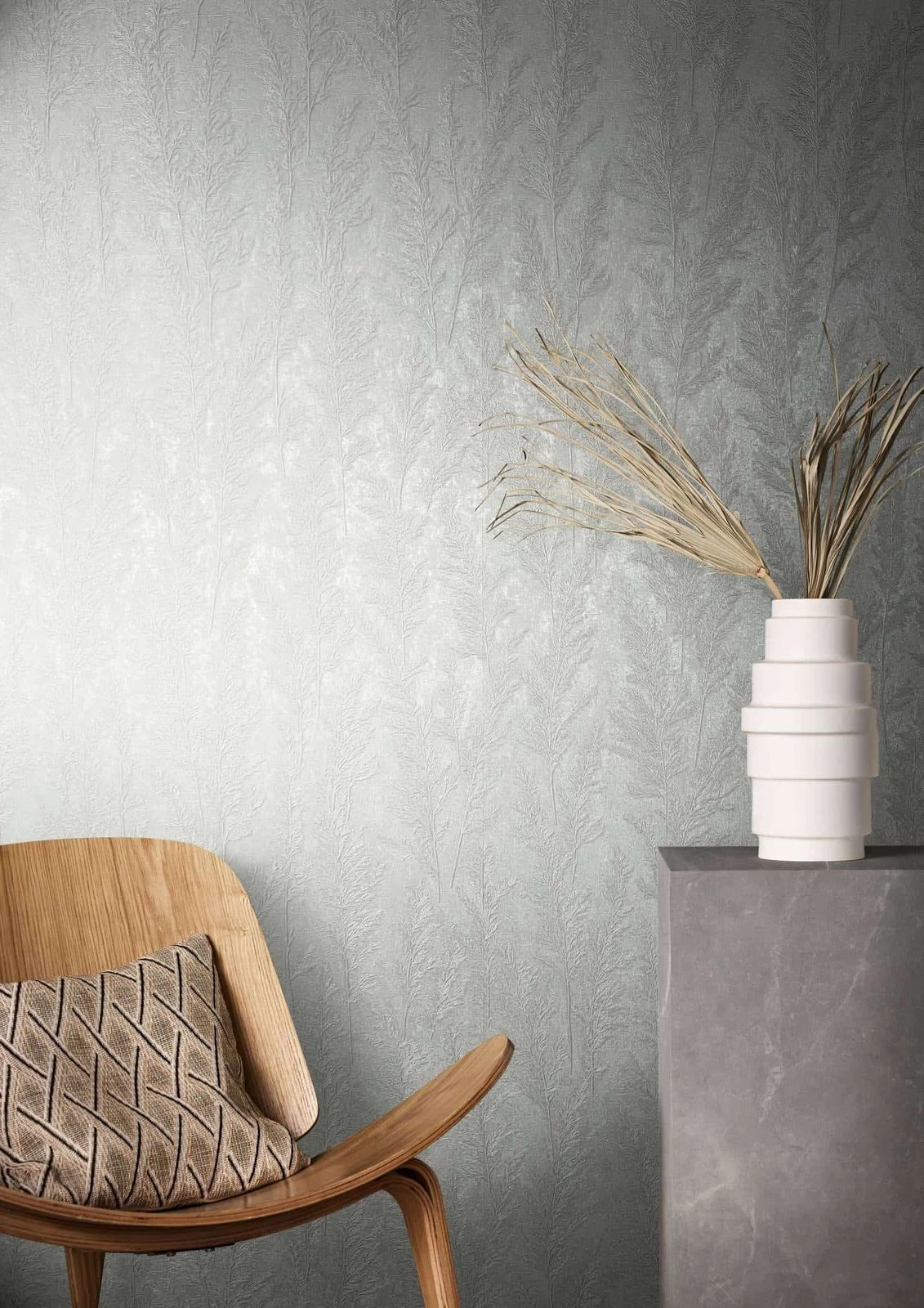 Ein Thema, mit dem wir uns alle auseinander setzen müssen ist der aktuelle Klimawandel und was es bedeutet nachhaltiger zu Leben. Der Designer Felix Diener aus dem Hause Marburg beschäftigte sich intensiv mit diesem Thema und hat in seiner Kollektion Natural Opulence mit vielen verschiedenen Naturmaterialien wunderbare Muster designt. Die Vliestapete 85735 mit Gräser-Pflanzen in weiß-grau glänzt edel in ihrem Metallic-Effekt und lädt zum Entspannen ein.